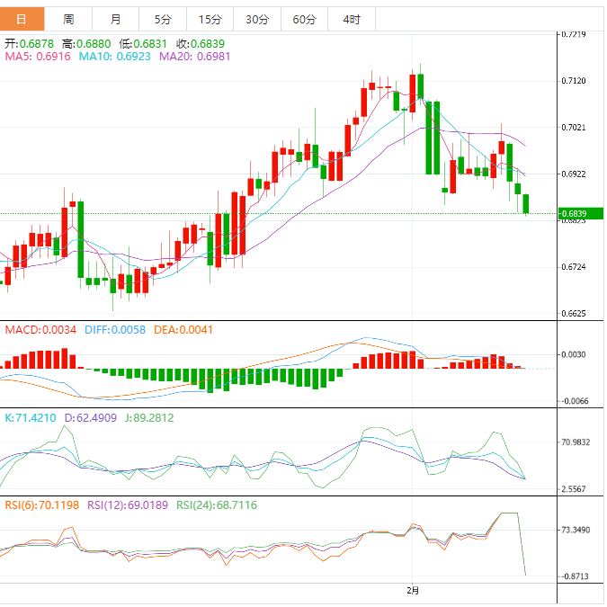周五盘中,澳元兑美元下跌至0.6841,跌幅0.57%。 澳元基本面:澳元/美元延续自0.7030区域回调,连续第三天下跌。亚市在美元全盘走强的提振下澳元/美元维持下跌趋势,打压汇价跌至1月6日以来的最低水平。澳元/美元下跌也可以归因于隔夜跌破50日移动均线后出现一些技术面抛售。这是继澳元/美元最新数底未突破0.7000心理