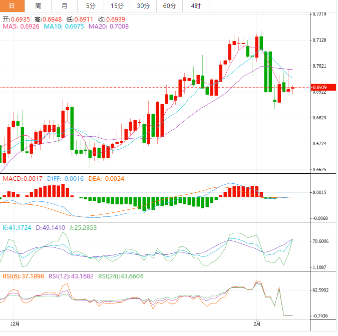 周五盘中,澳元兑美元上涨至0.6941,涨幅0.06%。 澳元基本面:澳元兑美元自盘中低点反弹,在0.6930附近日内跌势。由于美关键数据发布前市场情绪谨慎,加上催化剂不一,该货币对陷入整理。澳洲联储发布的季度货币政策声明未能给澳元兑美元交易员带来深刻印象,即便发表了鹰派的经济展望并准备进一步加息。这可能是因为