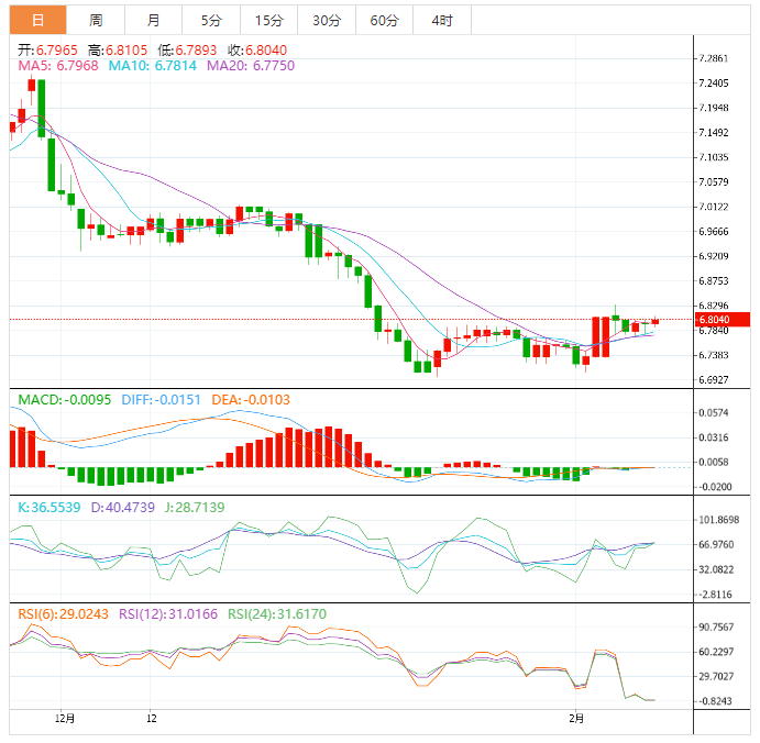周五亚洲时段,美元兑离岸人民币未能测试一轮阻力位6.8000之后,美元兑离岸人民币已经稳步下跌。中国1月份的物价(1月)仍低于预期,美元兑离岸人民币出现了下跌。 年度通胀数据已经达到2.1%,介于普遍预期的2.2%和之前公布的1.8%之间。月度通胀数据显示,通货紧缩为0.8%,而通胀压力则上升了0.7%。 与此同时,