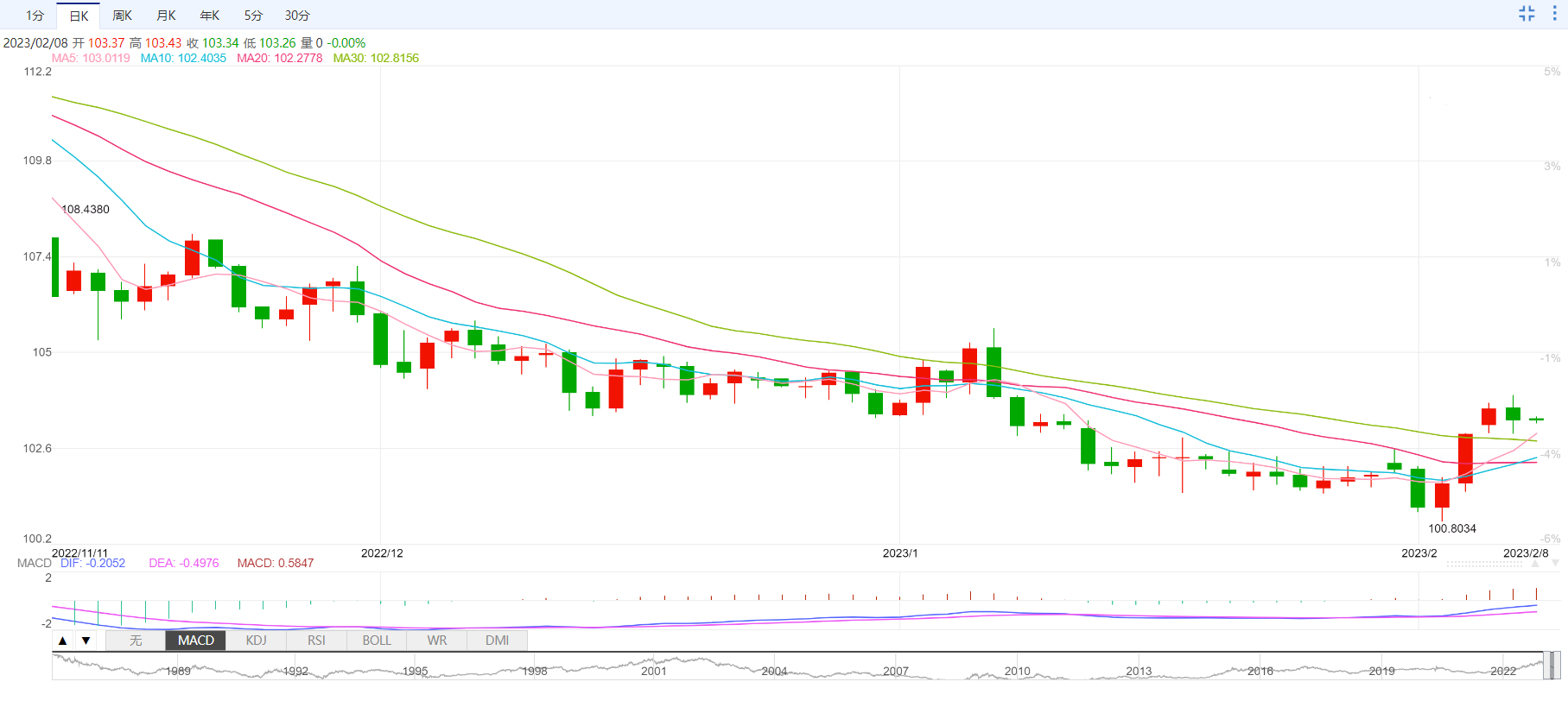 今日外汇市场走势分析 周三亚洲时段,美元指数窄幅震荡,目前交投于103.35附近。周二美元指数涨势受阻,从一个月高位回落,因为尽管上周五的美国非农就业报告大放异彩,但美联储主席鲍威尔并没有恢复鹰派立场,鲍威尔重申了上周关于通胀已经开始放缓的声明,他预计今年通胀将大幅下降。这使投资者相信,美联储不可能