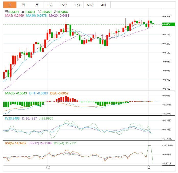 周五盘中,纽元兑美元下跌至0.6466,跌幅0.15%。 基本面上,纽元兑美元在当前阻力位0.6480下方表现出横盘震荡。由于投资者正在等待财新服务业I和美国非农就业(F)数据的发布,纽元资产已经横盘。疲弱的企业业绩削弱了标准普尔500指数期货连续三天的上涨势头,该指数目前大幅下跌,反映出避险情绪。美元指数(DXY)由