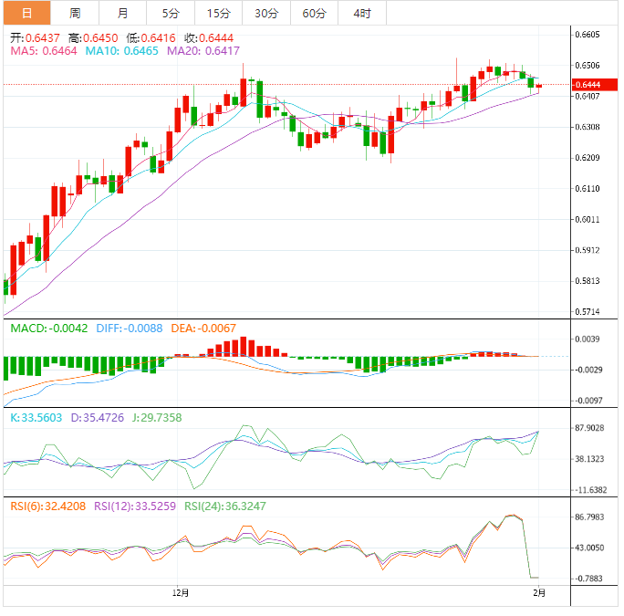 周三盘中,纽元兑美元上涨至0.6446,涨幅0.12%。 基本面上,由于就业数据(第四季度)和财新制造业I数据的公佈,纽元在亚洲时段仍然极为波动。就业变化从预期的0.3%和之前公佈的1.3%下降到0.2%。此外,季度劳动力成本指数为1.1%,低于预期的1.3%,但与之前公佈的1.1%相近。 技术面上,纽元兑美元稳定在A50下方