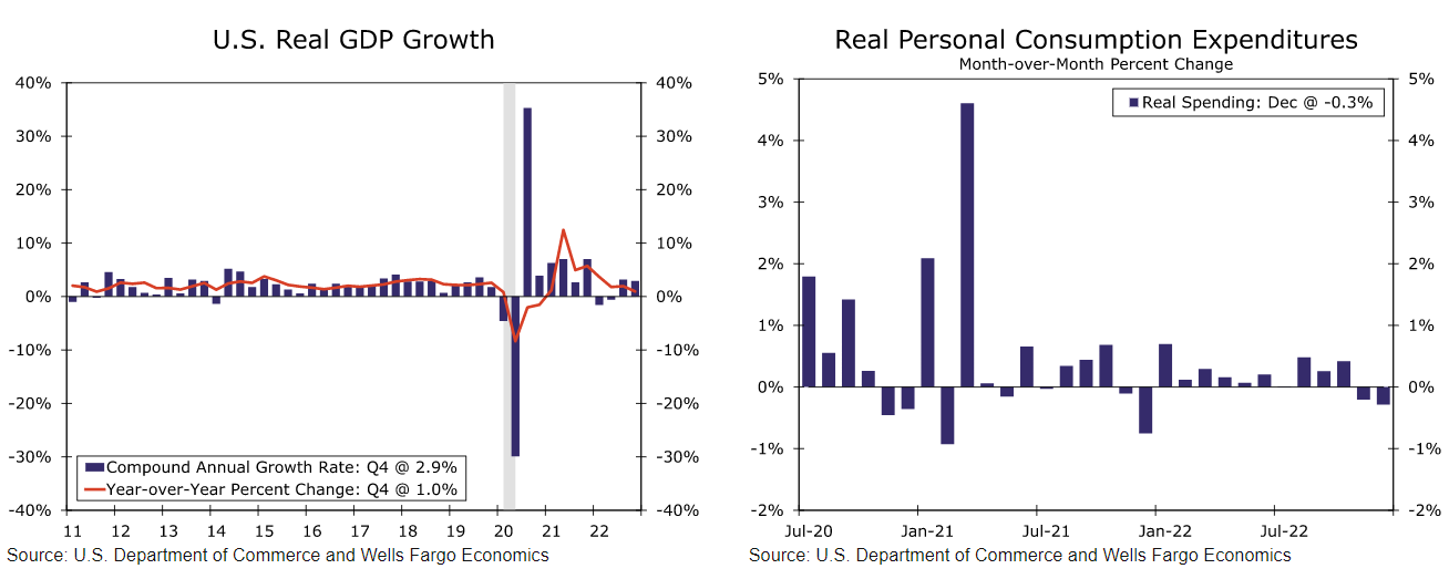 乍一看,本周的GD报告显示,美国经济在第四季度以高于趋势的速度扩张。然而,基本细节不如强于预期的整体增长那么令人鼓舞。结合最近月度数据的疲软表现,第四季度GD报告表明,美国经济在去年结束时明显失去了动力,这种势头可能会持续到2023年。 与第三季度相比,第四季度实际GD折合成年率增长了2.9%。这标志着连