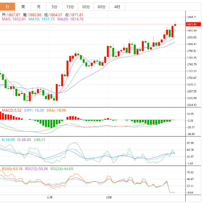 周一盘中,现货黄金震荡上涨,一度创近八个月高点至1879.36美元/盎司,因上周美国经济数据表现不佳,市场美联储将缩小1月份加息幅度,美债收益率跌至近两周低位,美元指数上周五大跌后周一延续跌势,逼近逾半年低位,给金价提供上涨动能。 美原油小幅上涨,目前交投于74.85美元/桶附近,中国重新开放边境提升了燃料需