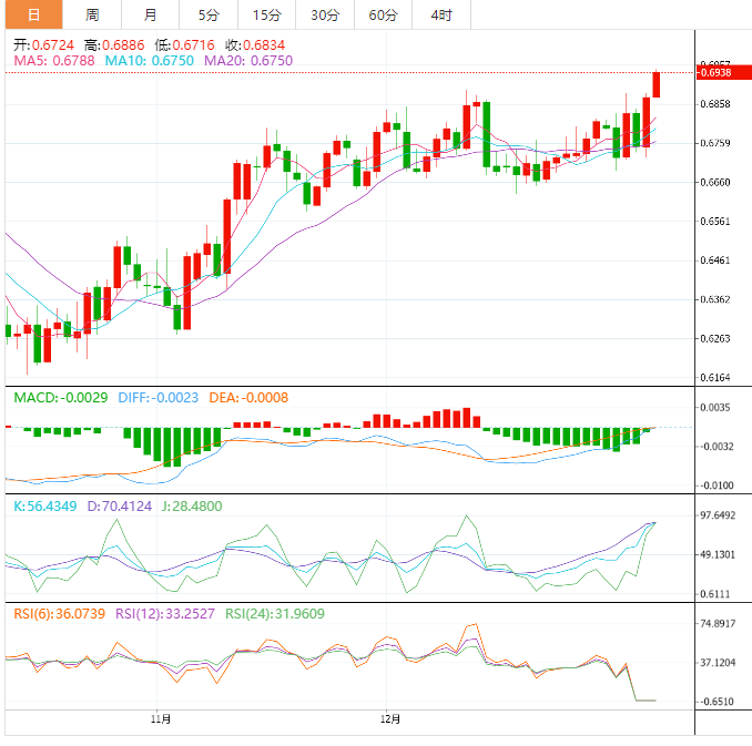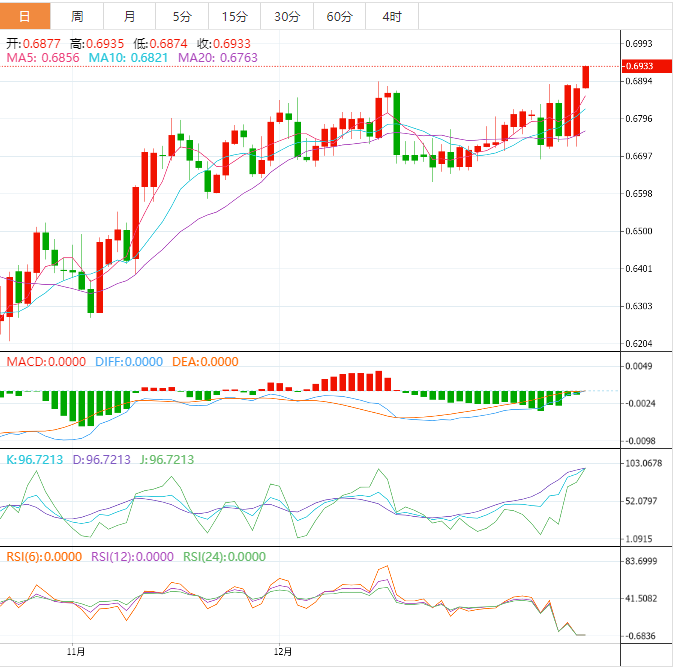 周一盘中,澳元兑美元上涨至0.6940,涨幅0.93%。 澳元基本面:澳元兑美元在短期阻力位0.6930附近盘整。由于美元指数大幅波动,该资产料继续上扬。美元指数目前跌破103.25,因风险偏好情绪料跌破关键支撑位103.00刷新六个月低点。澳大利亚11月建筑许可同比下降15.1%,此前为-6.4%。进一步的细节显示,月环比数据也从之