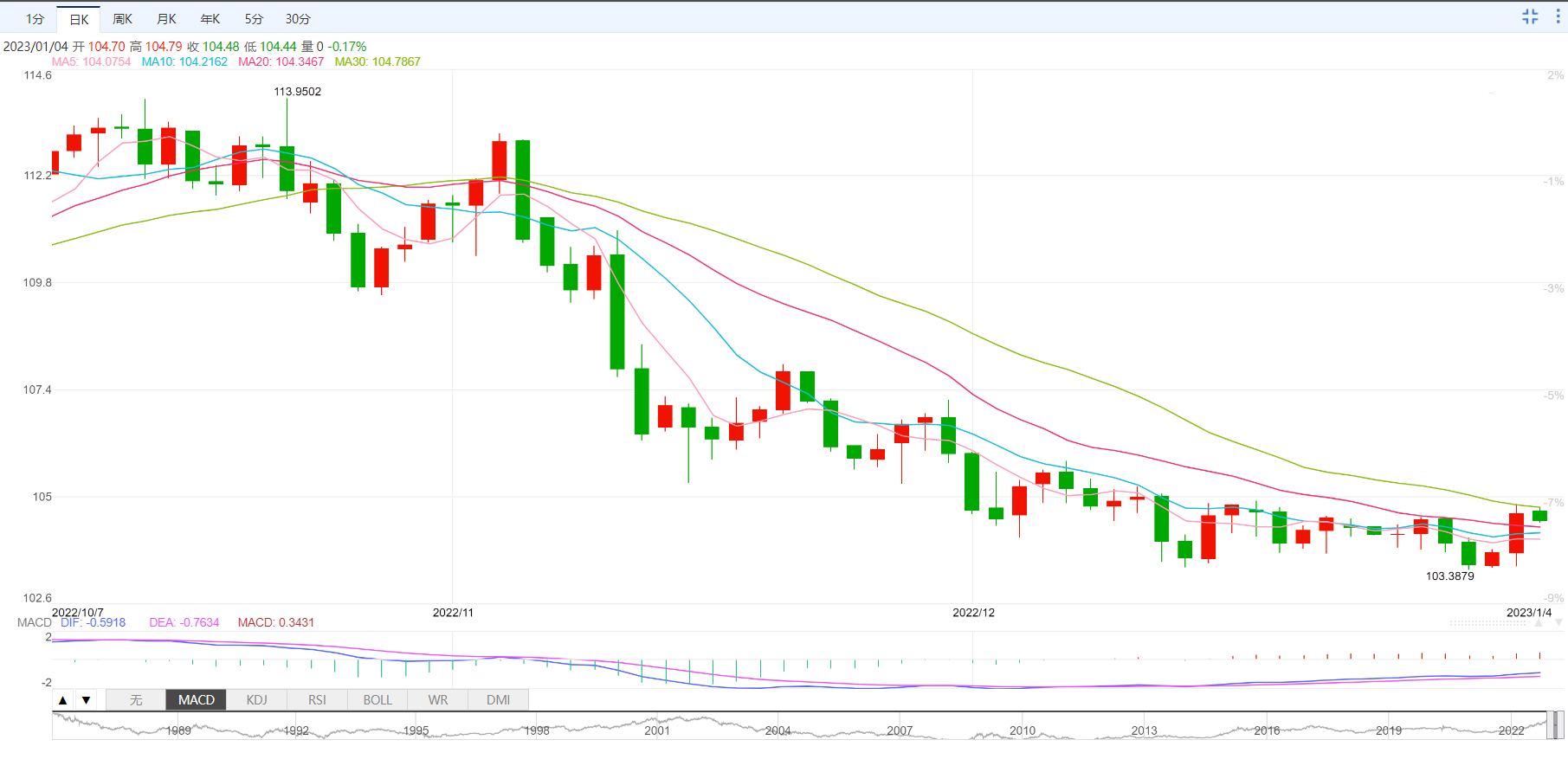 今日外汇市场走势分析 周三盘中,美元指数窄幅震荡,目前交投于104.47附近。守住了隔夜大部分涨幅。美元周二跳涨0.9%,盘中一度创逾两周新高至104.86,收报104.68,美国11月建筑支出意外反弹,而且欧元因通胀缓和下跌,美联储将于周三纽约时段发布12月会议记录。 美元兑一篮子货币盘尾上涨0.91%,收报104.68,为近
