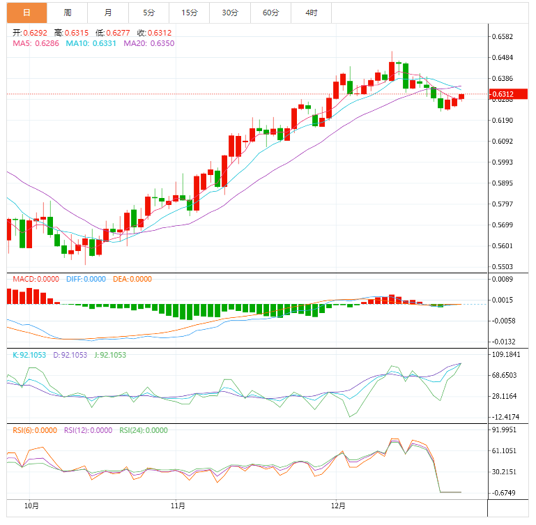 周二盘中,纽元/美元多头连续三日上涨,并整理于0.6300整料关附近。在这种情况下,美元全盘疲弱,且市场维持风险偏好,美元获得提振。然而,最近中国公佈的经济数据疲弱,且市场维持假期情绪,对多头构成考验。 基本面上,中国1-11月规模以上工业企业利润年率下降3.6%,而前值为-3.0%。此外,来自俄罗斯和朝鲜的地缘