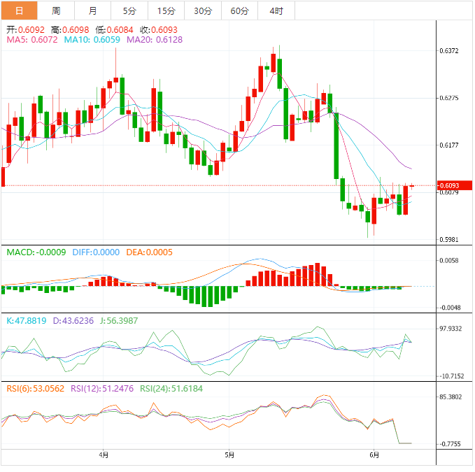 周五盘中,纽元兑美元上涨至0.6096,涨幅0.01%。 基本面上,纽元兑美元在欧市早盘自0.6085强势反弹。该资产正致力于收复0.6100的整数水平阻力位,因为美元指数短暂回调至103.42后回撤。由于投资者预计美国就业市场状况放鬆将促使美联储在6月暂停加息,美元承压。虽然中国经济出现通缩,但纽元涨势没有减弱。从环比看