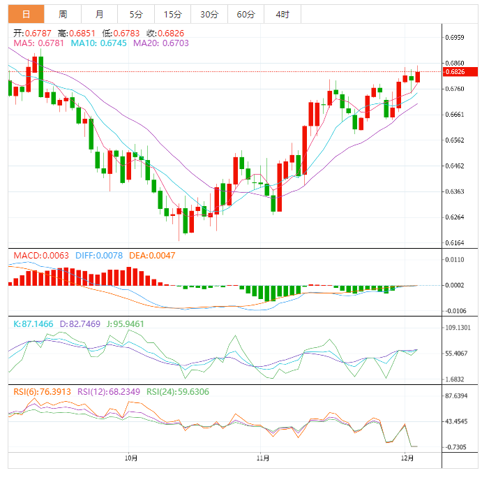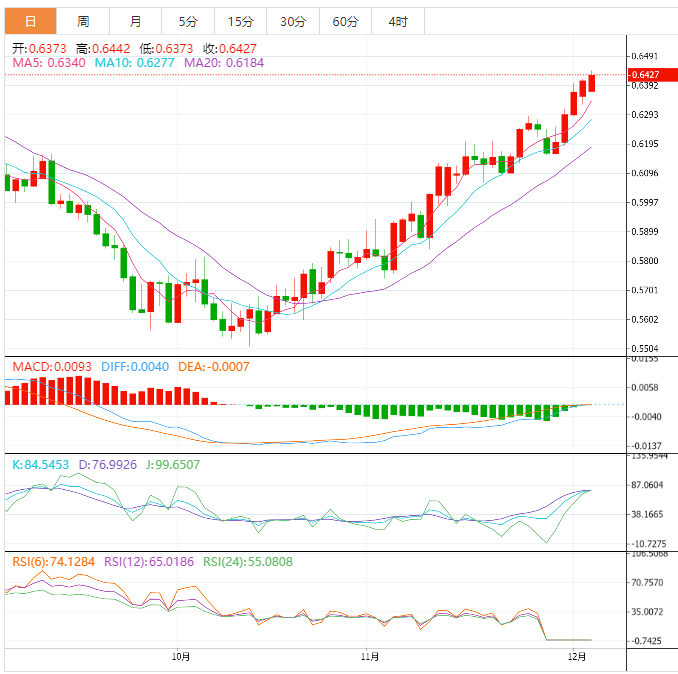 周一盘中,纽元兑美元上涨至0.6429,涨幅0.28%。 基本面上,纽元/美元继11月中旬以来连续数日收盘上涨后处在看涨周期的高位附近。继纽元/美元上涨接近8月高位0.6468后,汇价已已反弹至高位0.6417。美元一直构成驱动因素,市场情绪反转,支持风险偏好和高风险货币。美国就业报告意外强劲打压美元,并下跌测试104.50。