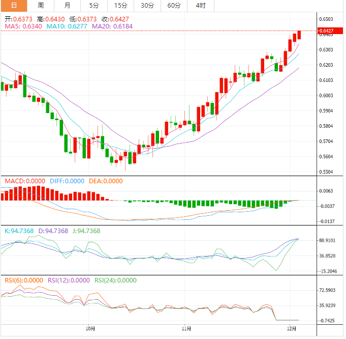 周一,在糟糕的中国数据之后,纽元/美元在11月中旬以来的一系列看涨收盘后,处于看涨周期的高点。在向8月份的高点0.6468移动之后,该货币对已经反弹至0.6417的高点。美元一直是驱动因素,市场情绪的转变支持了风险偏好和高贝塔综合体。 据路透社报道,一项私营部门企业调查周一显示,随着新冠肺炎防控措施的扩大,需