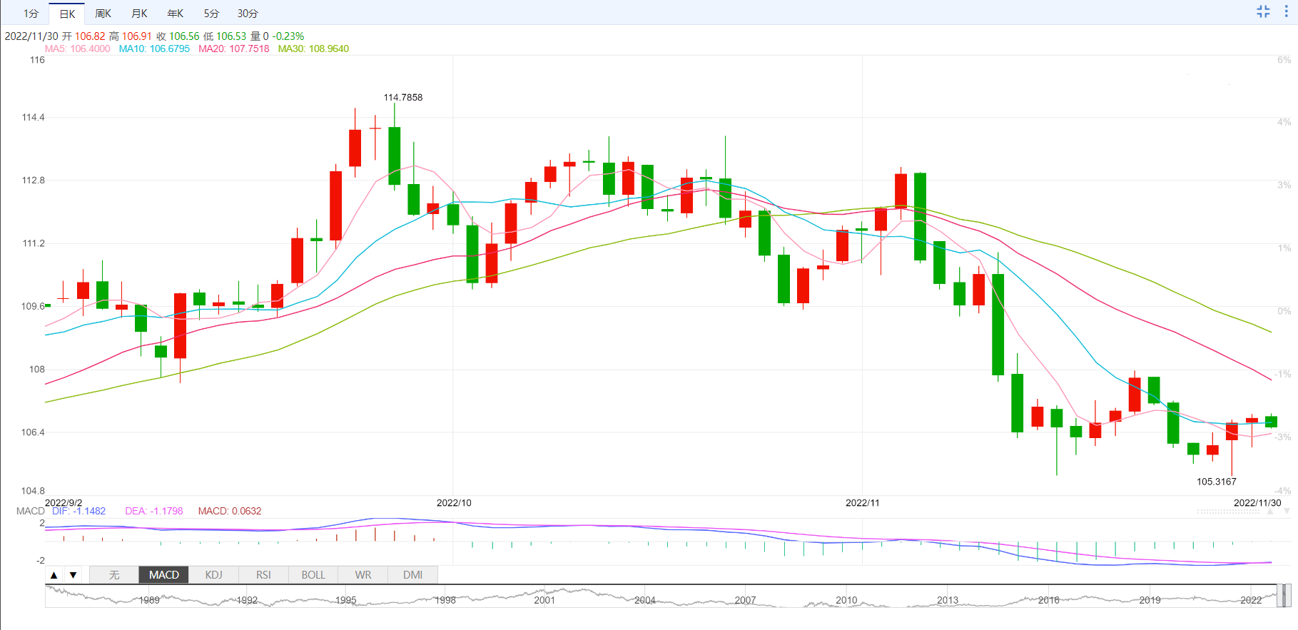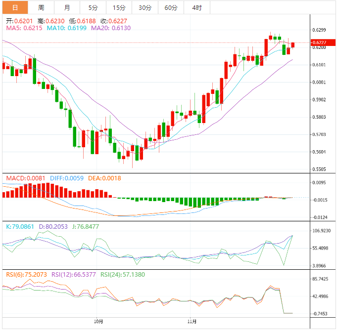 周三盘中,纽元兑美元上涨至0.6228,涨幅0.42%。 基本面上,新西兰10月季调后营建许可环比下降10.7%,预期增长2.4%,前值增长3.6%。中国11月官方制造业採购经理人指数下跌至48.0,预期49.2,前值49.0,而非制造业I从48.7下降至46.7,预期51.7。纽元/美元交易员应关注美联储主席鲍威尔自11月会议以来的首次讲话,