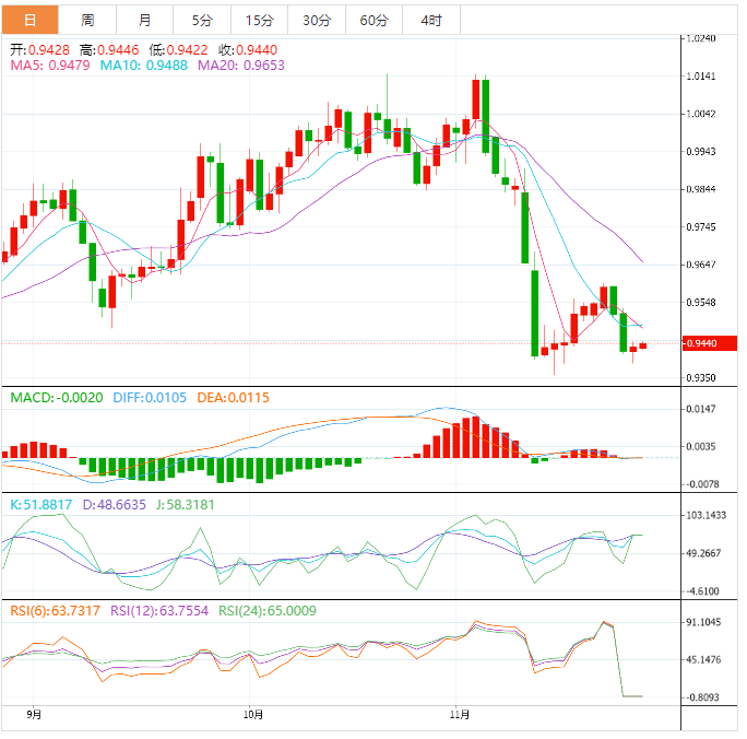 周五盘中,美元/瑞郎上涨至0.9443,涨幅0.11%。 基本面上,美元/瑞郎已突破阻力0.9940。早盘,美元指数震荡剧烈,风险敏感型货币已经略现做空情绪。目前判断风险状况正在发生变化还为时过早,因为美元波动并没有任何基本面催化剂支持。瑞郎方面,投资者正在观望週五公佈的第三季度就业数据。瑞士就业水平预期将升至5