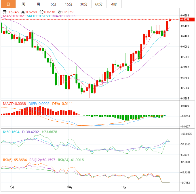周四盘中,纽元兑美元上涨至0.6261,涨幅0.21%。 基本面上,新西兰储备银行行长表示,新西兰储备银行现金利率正式处在紧缩政策当中,原因是新西兰储备银行试图降低通胀。纽元/美元目前处在上涨当中,已经走高刷新高位,再度突破0.6250区域,正接近近三个月来的最强水平。新西兰储备银行宣布大幅加息75个基点,要走在