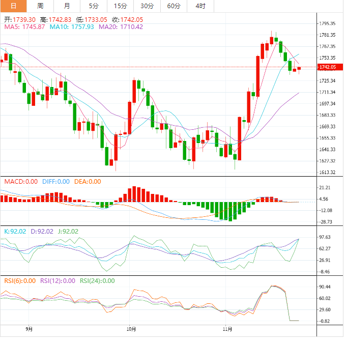 黄金价格走势综述 周四早盘,黄金交投于1754.72附近。黄金市场在本月初从两年来的低点反弹后,目前仍保持着稳固的涨势。然而,一位市场分析师表示,从整体宏观经济形势来看,这种贵金属被高估了。 日内关注,美国截至11月24日当周全美钻井总数,美国截至11月24日当周石油钻井总数,韩国10月I年率,新加坡截至11