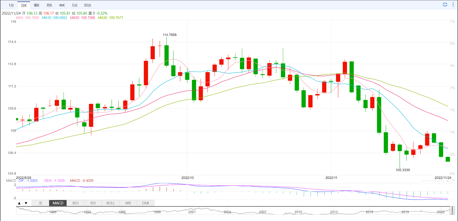 今日外汇市场走势分析 周四盘中,美元指数小幅下探,一度创逾一周新低至105.82,延续隔夜跌势。美元周三全线下跌,此前美联储公布的11月会议记录显示,联储大多数决策者同意很快就应该放缓加息步伐;另外美国11月arkit制造业I数据差于预期,也对美元产生拖累。周三美元指数收跌0.95%,为11月14日以来最大单日跌幅