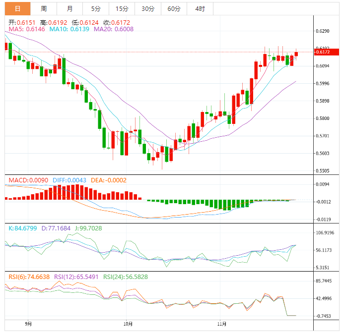 周三盘中,纽元兑美元上涨至0.6169,涨幅0.23%。 基本面上,由于纽储行行长阿德里安·奥尔最新评论令纽元多头失去动能,纽元/美元在周三早些时候自0.6200-0.6166附近的盘中高点回撤。继新西兰储备银行(RZ)上调官方现金利率(OCR)75个基点后,纽元兑美元在0.6130-0.6178区间剧烈波动。这一次,新西兰央行放弃了50个基