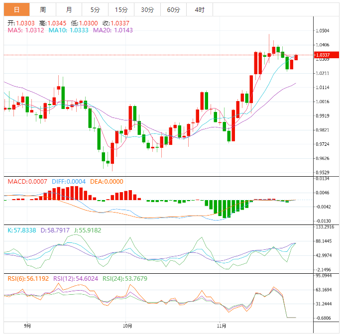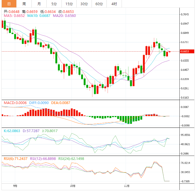 周三盘中,澳元兑美元上涨至0.6654,涨幅0.08%。 澳元基本面:尽管11月澳大利亚i数据走软,但对恢复与中国友好关系的希望,加上近期走强的股市和低迷的美国国债收益率,推动了澳元兑美元的多头。澳大利亚储备银行(RA)行长菲利普·洛表示,如果工资上涨,将使澳大利亚的通胀保持在“7%左右,或多或少(一点)”。他补