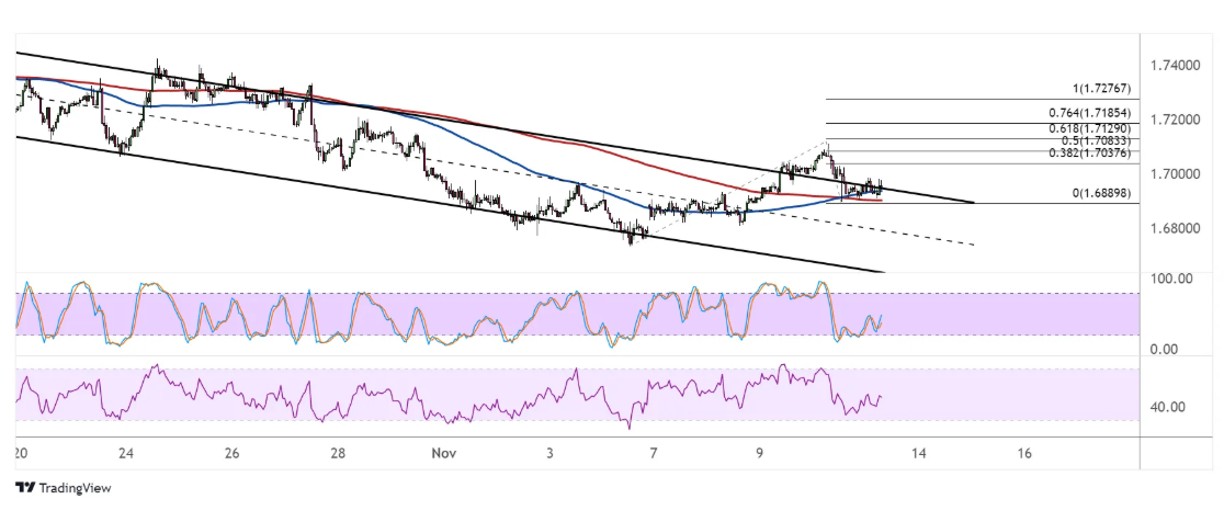 欧元兑纽元在4个小时内突破了下行通道的阻力位,表明下行趋势的逆转正在进行中。自那以后,价格回落到先前的阻力位,这似乎是支撑位。 如果是这种情况,欧元兑纽元可能会瞄准下一个由斐波那契扩展工具标记的上行目标。38.2%的扩展在1.7037,然后50%的水平在1.7083。 更强劲的看涨势头可能使欧元兑纽元上升至61.8%