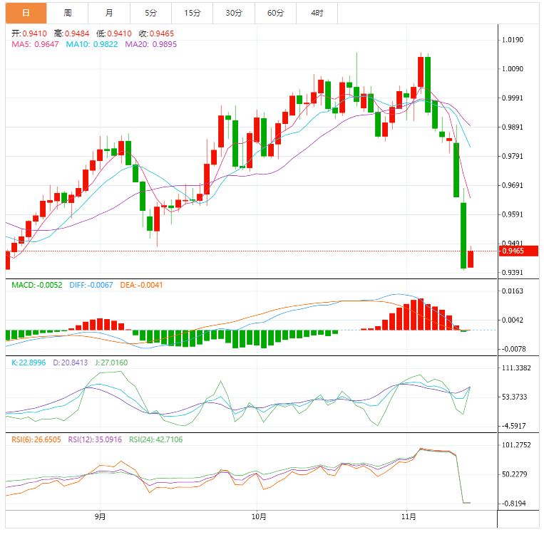 周一盘中,美元兑瑞郎上涨至0.9467,涨幅0.57%。 基本面上,美元兑瑞郎突破日内阻力0.9455后,延续反弹势头。随著市场风险偏好佔据主导地位后正逐渐失去动力,避险行情正获得支持。美元兑瑞郎连续6天的跌势暂时停止。美元指数继录得三个月低位106.28反弹至106.90附近。标准普尔500指数期货上周末延续上涨之后出现下跌
