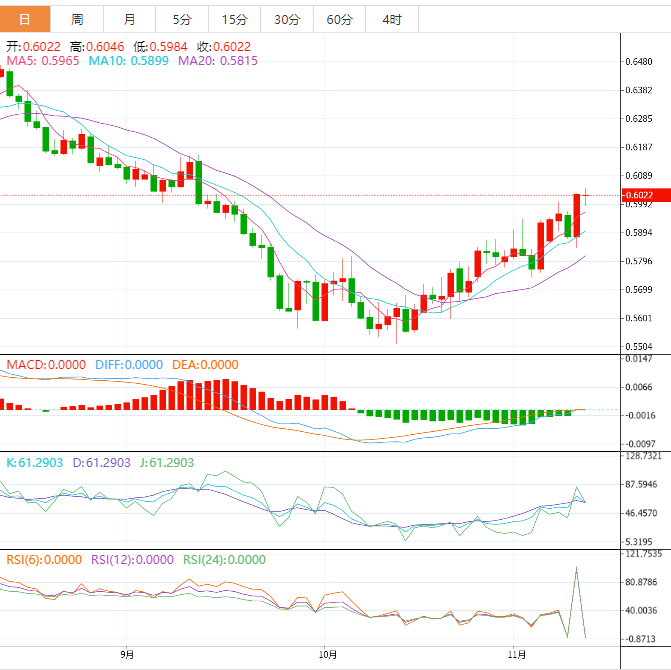 周五盘中,纽元兑美元在0.5985附近吸引了一些逢低买盘并在欧市早盘触及近两个月高点。汇价目前略低于0.6050,目前料进一步升破100日A均线。 基本面上,市场依然定价美联储在12月加息50个基点的机率更大。进而可能帮助缓解美元下行压力并限制纽元兑美元上行,至少目前如此。此外缺乏强劲的跟进买盘值得看涨交易员保