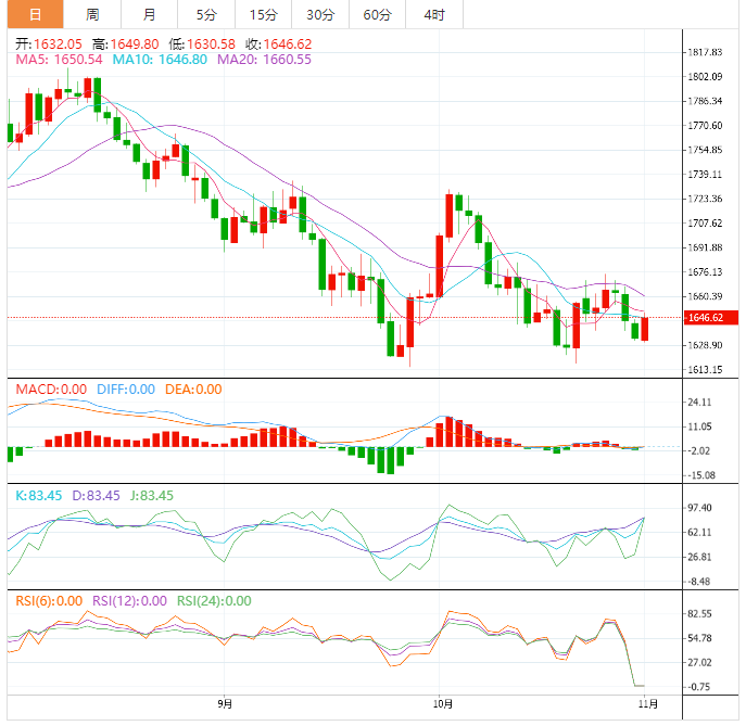 周二盘中,现货黄金探底回升,早些时候早1630关口附近获得支撑后展开反弹,目前交投于1641.56美元/盎司附近,亚洲股市普遍上涨,打压了美元的避险买需,美元走弱给金价反弹机会,而且市场对美国10月份I制造业I数据的预期比较悲观,可能提升美联储12月份放缓加息部分的预期,也支撑金价。 美原油震荡上涨,目前交