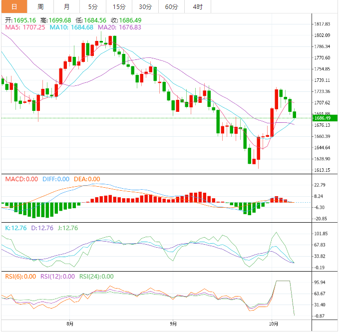 周一,现货黄金震荡走弱,一度创一周新低至1685.03美元/盎司,正好触及10日均线附近支撑,上周五出炉的美国9月份非农就业报告强于市场预期,强化了市场对美联储将继续积极加息的看法,美联储官员也多次重申进一步加息的决心,给美元和美债收益率提供支撑,金价因此承压,黄金TF持仓再度下降,也反映黄金多头士气受到打