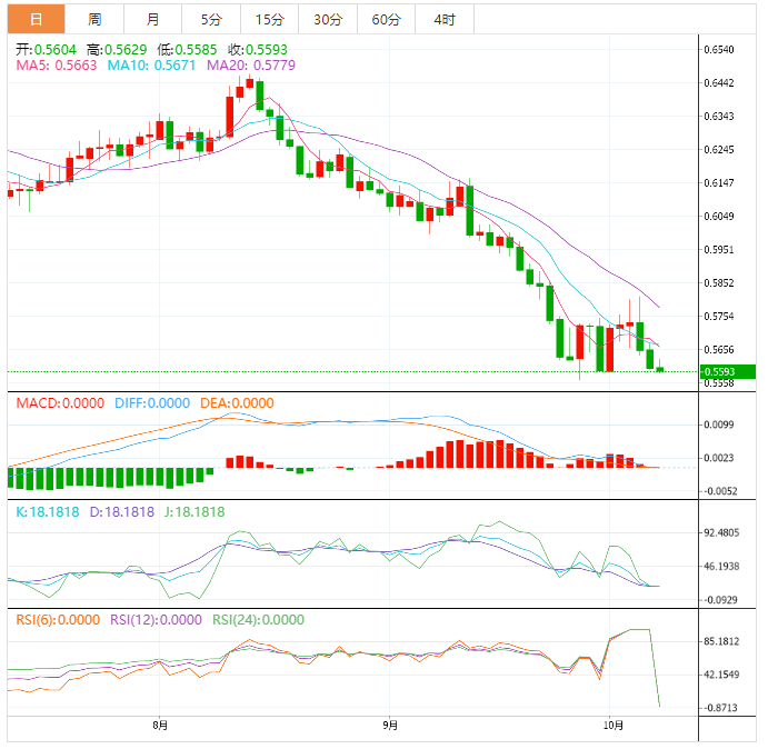 周一盘中,纽元兑美元下跌至0.5589,跌幅0.27%。 基本面上,纽元/美元已经跌破关键支撑位0.5600,原因是避险押注激增,迫使市场参与者纷纷抛售风险资产。纽元/美元已经跌破0.5597-0.5611区间内的小幅盘整区间,出现下行,预计后市纽元/美元将处在疲弱当中。 技术面上,纽元兑美元成功触及了第一个负面目标点0.5600