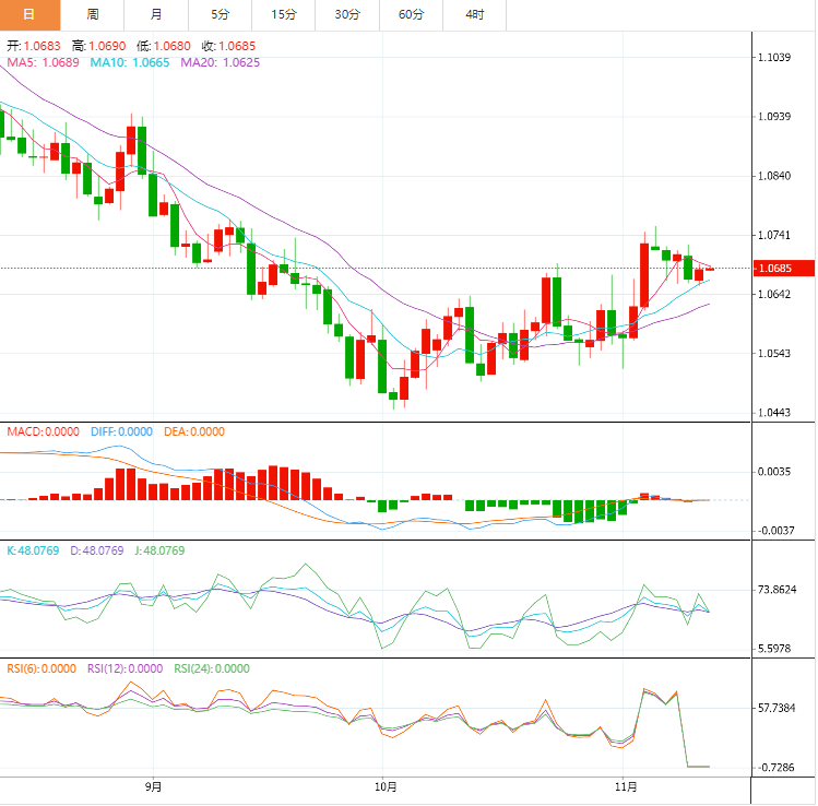 周一盘中,欧元兑美元在1.0700关口下方的狭窄交易区间内震荡。在欧元区第三季度国内生产总值(gd)公布之前,交易员倾向于观望。欧元区的季度增长率预计将收缩0.1%,而年度增长率预计将增长0.1%。疲软的报告可能会对欧元造成压力,并对该货币对造成不利影响。主要货币对目前在1.0685附近交易,当日保持不变。 从技术面