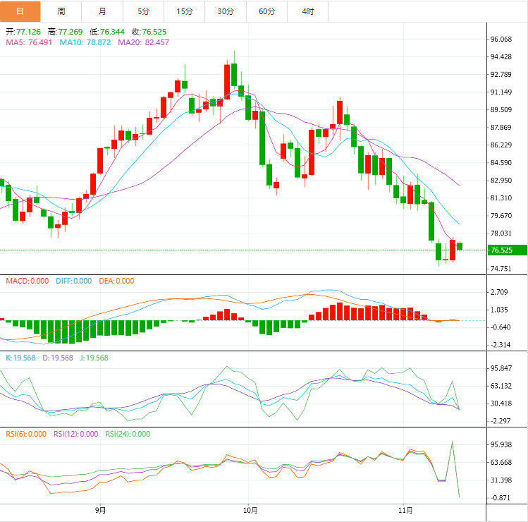 原油市场行情分析 周一亚盘,原油交投于76.81附近。原油价格的短期前景似乎谨慎乐观,对供应中断的担忧有所缓解,尤其是在中东地区,加上欧佩克及其盟国可能采取的行动,表明油价可能进入盘整阶段。然而,市场继续受到需求担忧的阴影,尤其是来自中国的需求担忧,这仍然是全球石油动态的关键因素。上周早些时候,由于