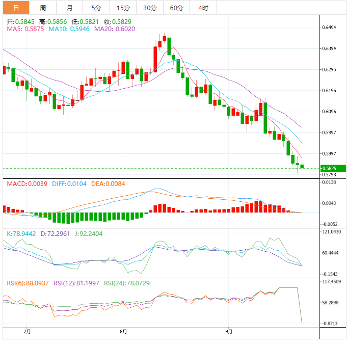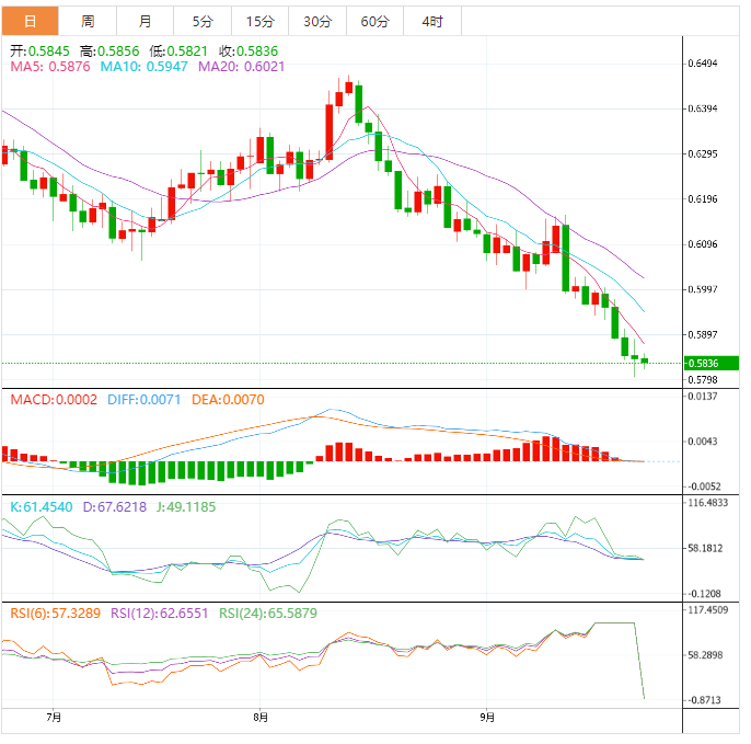 周五盘中,纽元/美元盘整于0.5836-0.5857窄幅区间,预计将实现下行突破,这将打压纽元/美元接近0.5800关键支撑位。 基本面上,纽元/美元继遇阻关键阻力0.5880后急剧下跌。若纽元/美元重测两年新低0.5804后将出现明确方向。根据美联储的政策,利率将达到峰值4.6%。最佳终端利率目标已明显得到上调,加大市场负面情绪,