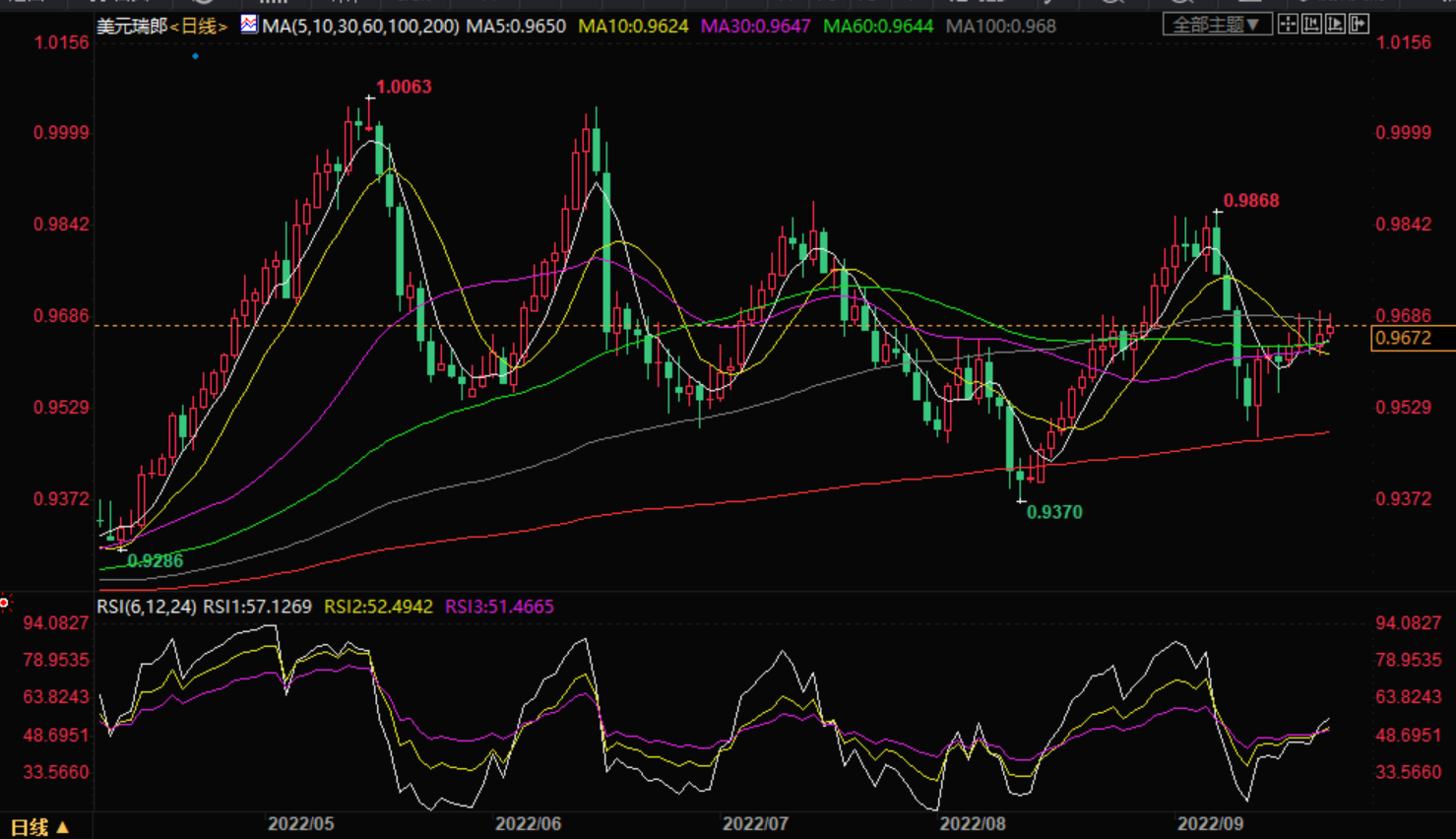美元/瑞郎整理于0.9660附近,继波动指标明显上升后,波动率出现回落。美元/瑞郎震荡于0.9620-0.9700的极端区间内,并继美联储决议公布后,投资者忙于分析美联储决议以明确市场方向,美元/瑞郎处在盘整当中。 基本面上,美联储已将利率目标定为4.6%,并希望到2023年底达到4.4%,远高于此前预期的高水平3.8%。这一政策