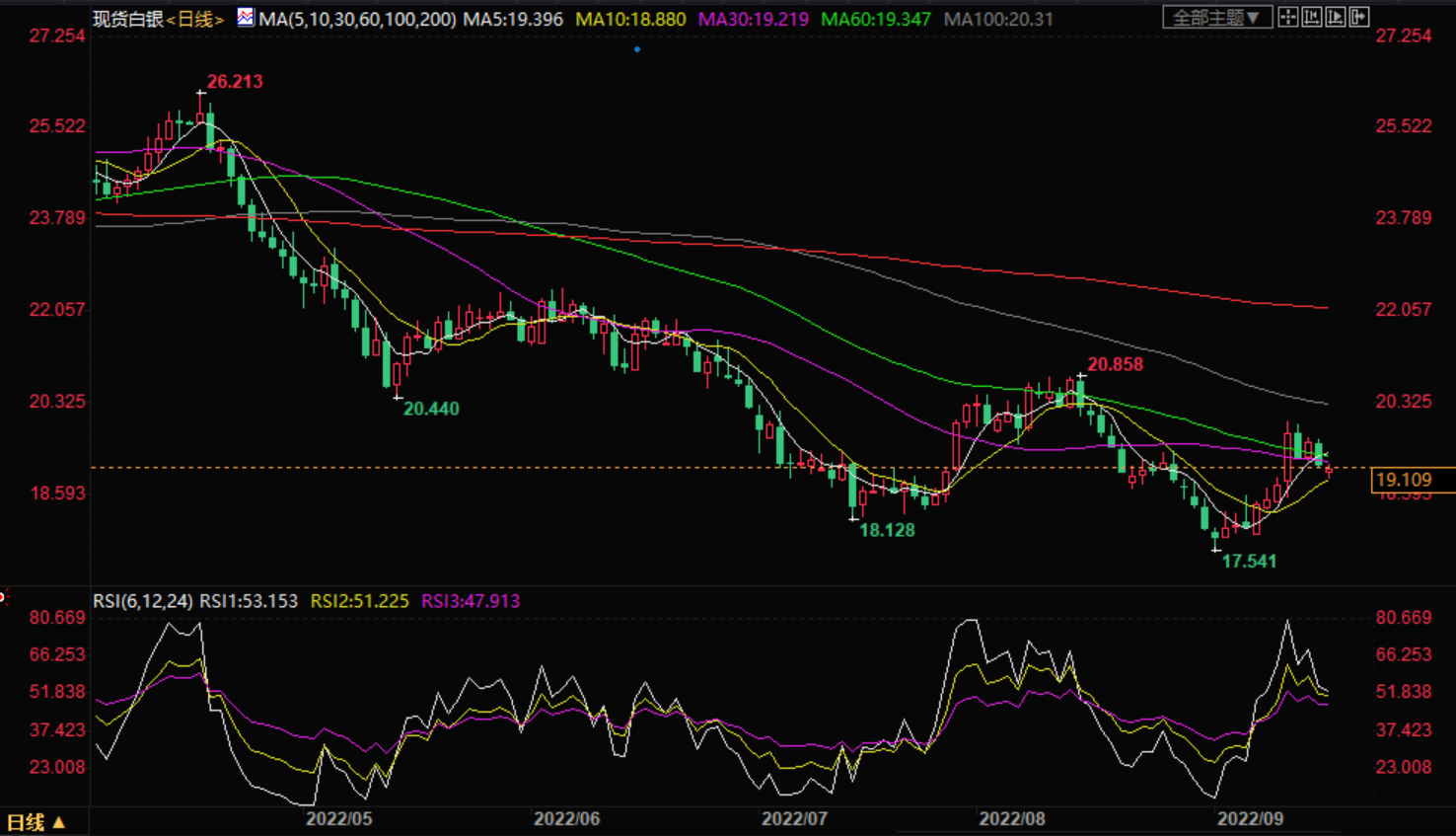 白银价格连续第二天下跌,原因是投资者对美联储激进政策的担忧,以及对美联储加息75或100个基点的预期。因此,美国国债收益率飙升,支撑了美元,对这种白色金属构成不利影响。截止目前,白银价格交易价为18.91美元,低于19.00美元的关口。 市场人气依然低迷,全球股市出现下跌。周四发布的美国数据为美联储连续第三次