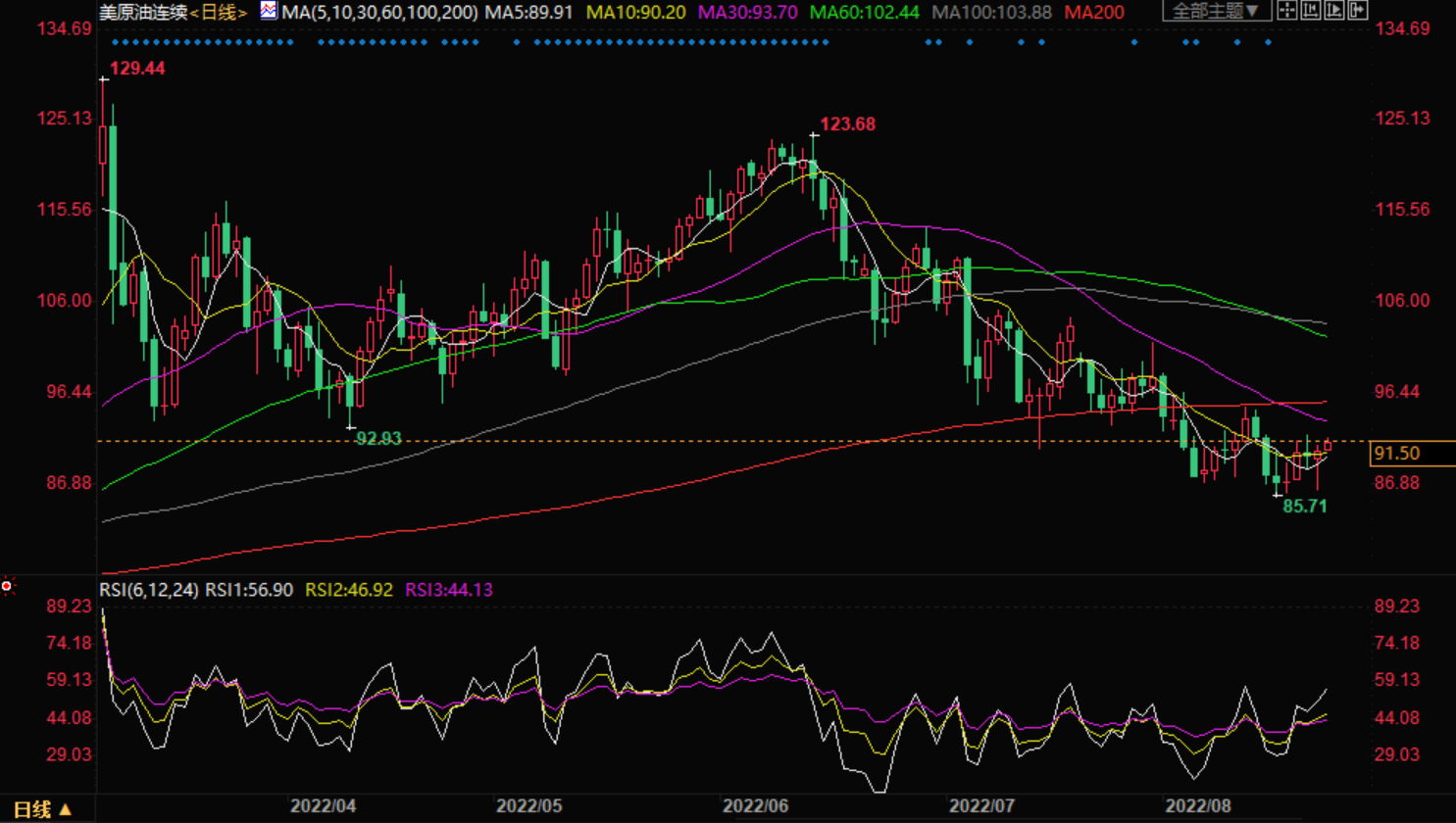 周二,现货黄金低位徘徊,目前交投于1736美元附近,距离隔夜创下的近四周低点不远,美元指数再度刷新逾五周高位,而且距离近20年高点不远,对金价打压明显,而且越来越多的分析认为美联储杰克森霍尔研讨会发出鹰派信息,这令黄金多头退却。 美原油震荡上涨,最高触及91.77美元/桶,虽然美股大跌、美元持续走强、欧元