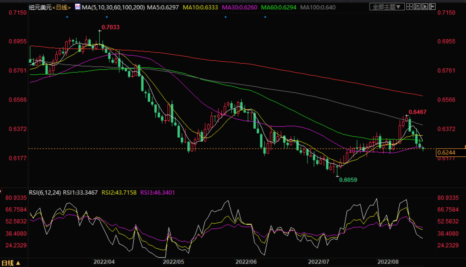 在5天的下跌趋势中,纽元兑美元走势不稳,在周五的亚洲交易时段刷新了两周低点0.6225。这样一来,新西兰货币对就没能让新西兰储备银行(RZ)行长阿德里安·奥尔(AdriaOrr)的鹰派言论,以及新西兰(Z)好坏参半的贸易数据振奋起来。原因可能与美元在美国经济数据走强、美联储立场强硬以及地缘政治/经济风险的背景下普遍走