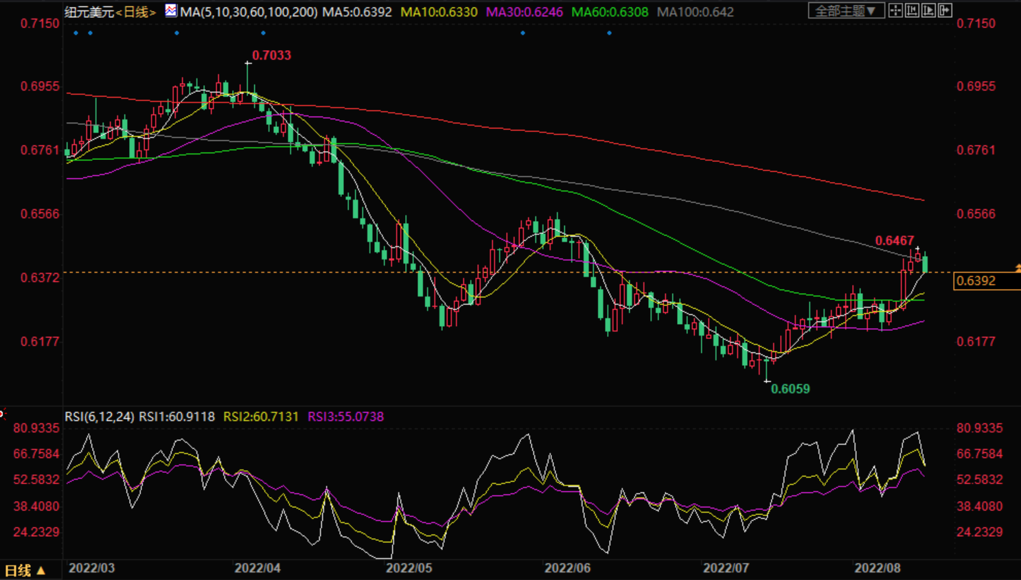 周一,纽元/美元仍刷新盘中低点0.6430附近。 基本面上,中国7月份零售销售年率降至2.7%,低于期值5.0%和前值3.1%,而工业生产(I)则从前值3.9%和期值4.6%小幅下降至3.8%。由于全球最大贸易伙伴中国的经济数据疲弱,纽元/美元出现自4月26日以来的下行倾向阻力(最新在0.6465附近)期待已久的回调。纽元/美元最新下跌也
