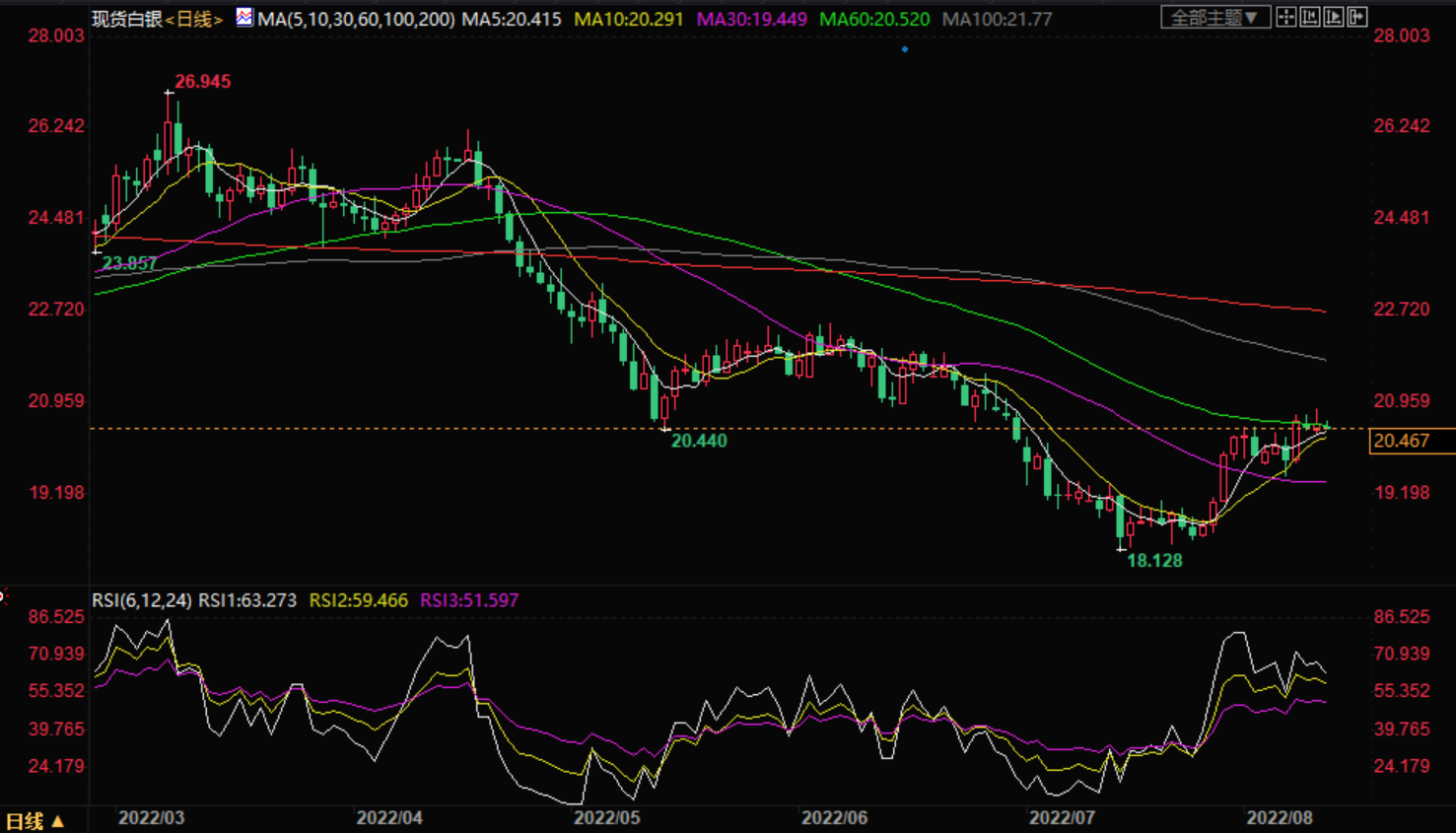 美国劳工部报告称,美国的通货膨胀率从40年来的高点9%以上下降,交易员以此为理由加大对高风险资产的押注。美国国债收益率下跌,这通常会推高贵金属价格,但这一次没有。截止目前,白银的交易价格为20.63美元。 受美国经济数据的推动,美国股市收盘大幅上涨,涨幅在1.6%至近3%之间。7月份通货膨胀有所降温,消费者价