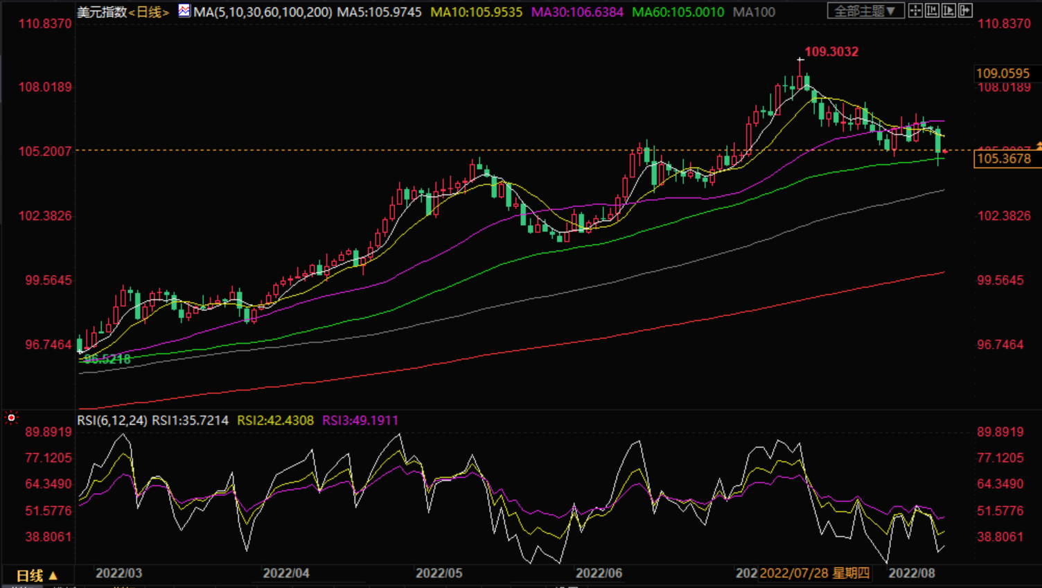 周四,美元指数在亚洲中期交易时段巩固了自3月初以来的最大单日跌幅。在这样做的过程中,美元对六种主要货币的衡量指标从美联储好坏参半的言论和围绕中国的担忧中寻找线索,以扭转美国通胀导致的损失,并刷新最晚在105.40附近的盘中高点。 美国7月消费者价格指数(CI)同比下降8.5%,预期为8.7%,前值为9.1%。数据公布