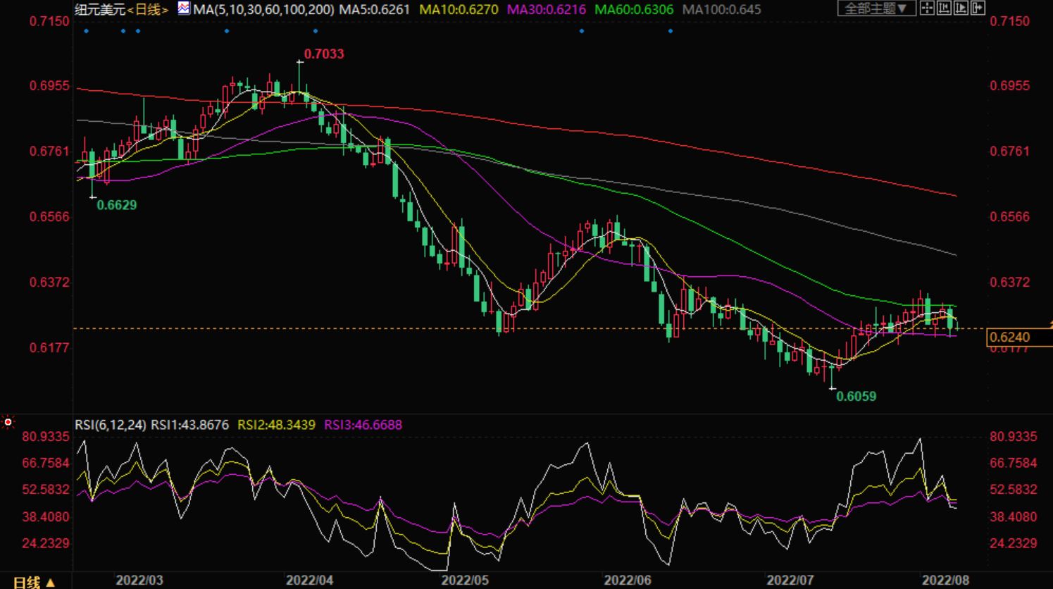 周一,纽元/美元跌至0.6235,周初出现的整理回调势头出现回落。 基本面上,新西兰联储周一发布最新货币状况调查报告显示,新西兰2022年第三季度通胀预期有所下降。被视为新西兰联储货币政策将传导至价格的时间周期两年期通胀预期指标自之前的3.29%小幅下降至3.07%。新西兰通胀预期指标下跌,打压纽元/美元,纽元/美元