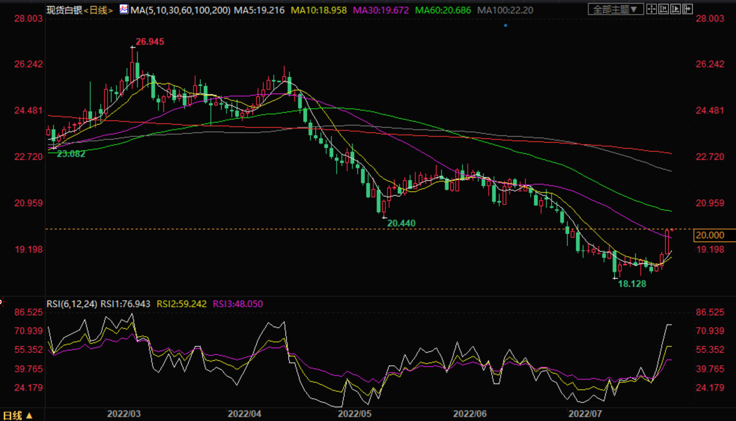白银价格连续三天上涨,本周上涨了近9%,这得益于交易员们对美联储“鸽派”倾向的乐观情绪,这刺激了美国国债收益率下降,并削弱了美元。除了前面提到的,美国第二季度惨淡的GD数据还减少了人们对美联储(fd)将在滞胀局面恶化之际继续以当前速度收紧货币政策的押注。在撰写本文时,白银交易价格为19.91美元。
