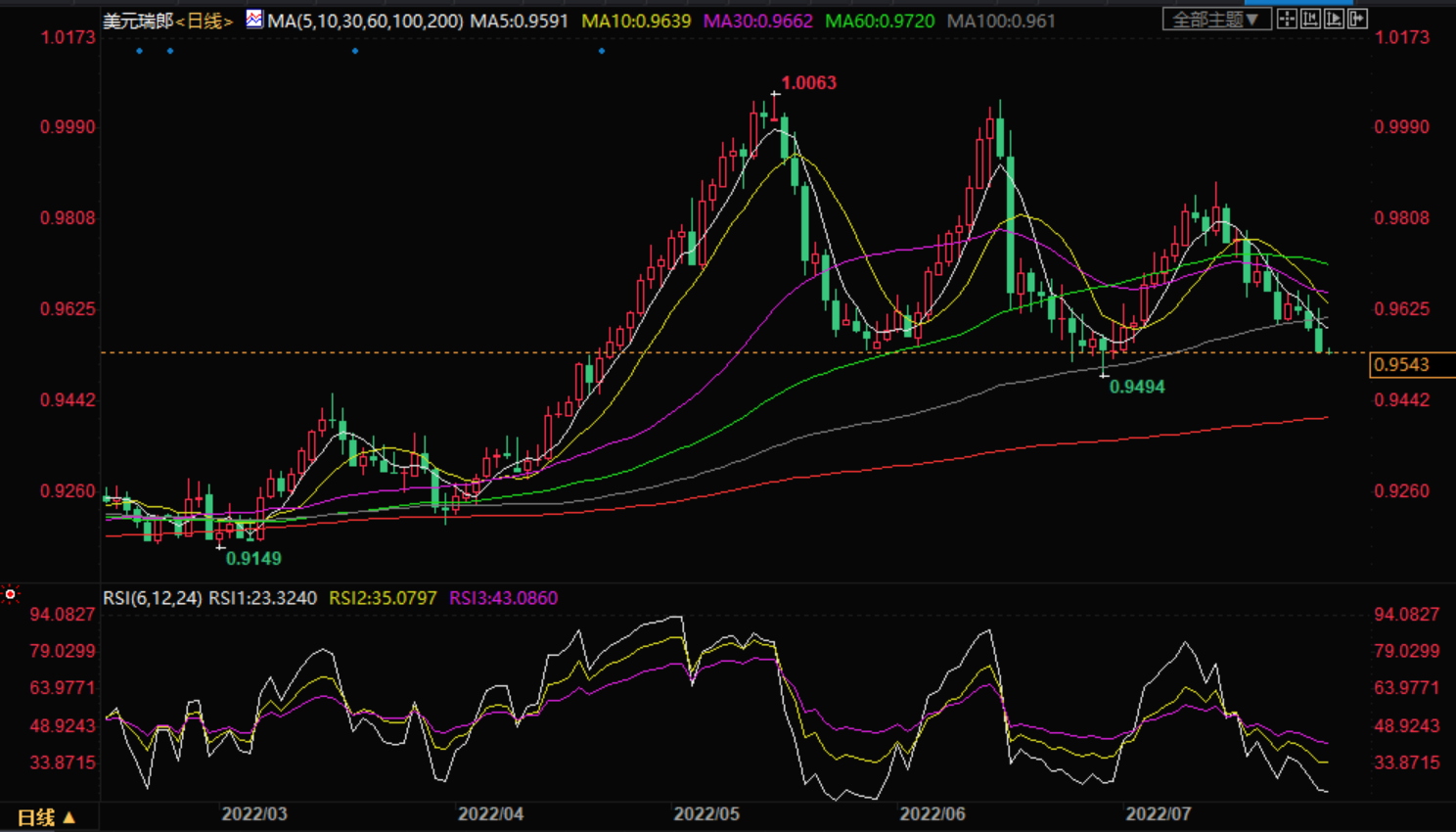 周五,美元兑瑞郎在纽约市场尾盘触及低点0.9540后,出现了信心不足的逆转。在周四发布的悲观的美国国内生产总值(GD)数据之后,美元兑瑞郎很可能延续其连续三天的下跌势头,因此进一步下跌仍是合理的,下跌走势将会将美元兑瑞郎拖向月低位0.9504。 美国经济分析局(urauofcooicAalyi)报告称,第二季度年