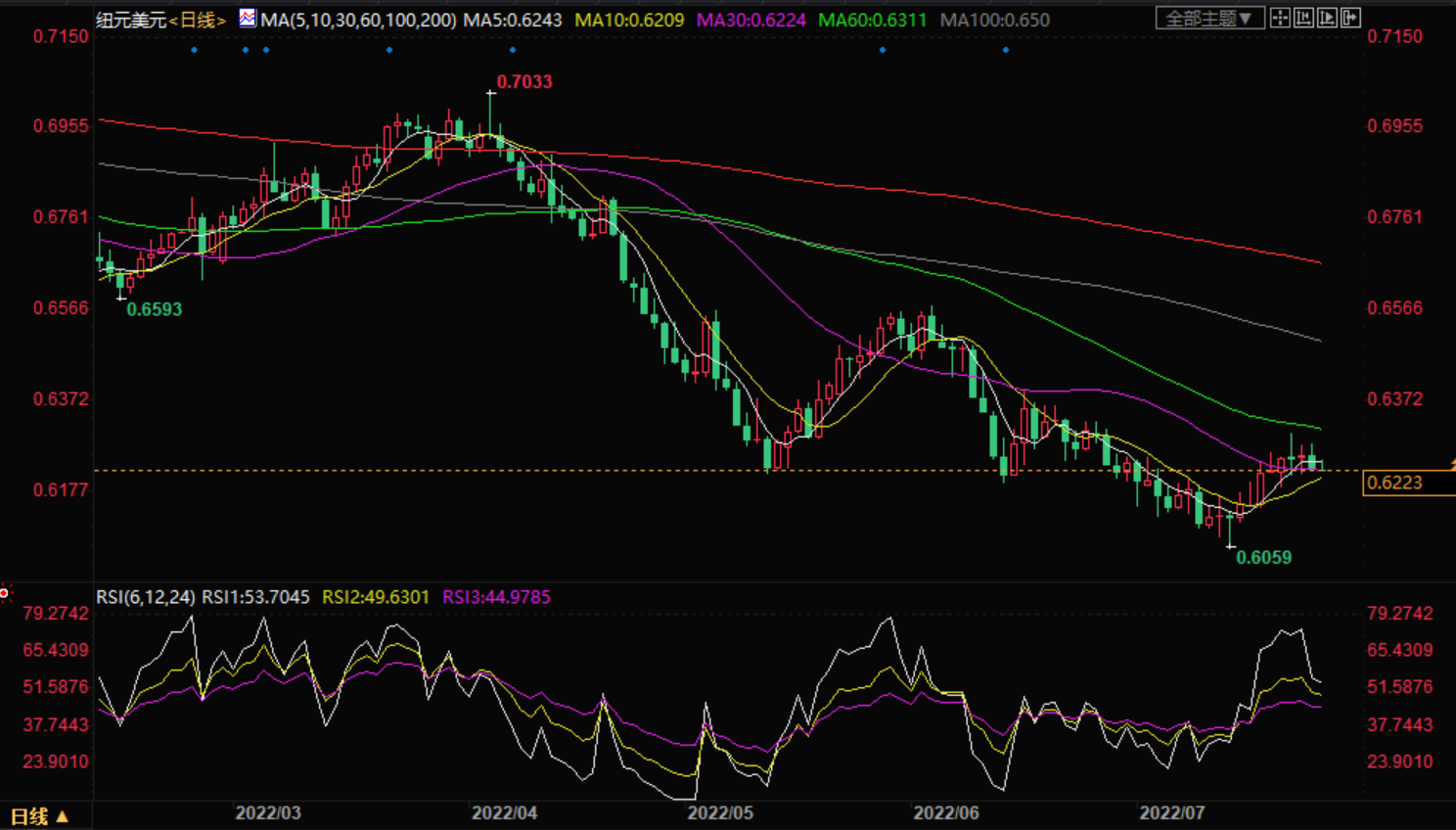 纽元兑美元从盘中低点0.6230左右小幅反弹后开始横盘。纽元兑美元已经守住了周二的低点0.6224,并且很可能延续其复苏势头,因为美元指数(DXY)正在寻找下行空间。 基本面上,新西兰储备银行(RZ)将监控政策收紧的表现,以了解央行在控制价格压力方面是否走对了方向。在经济数据方面,投资者将关注定于周四发布的澳新银