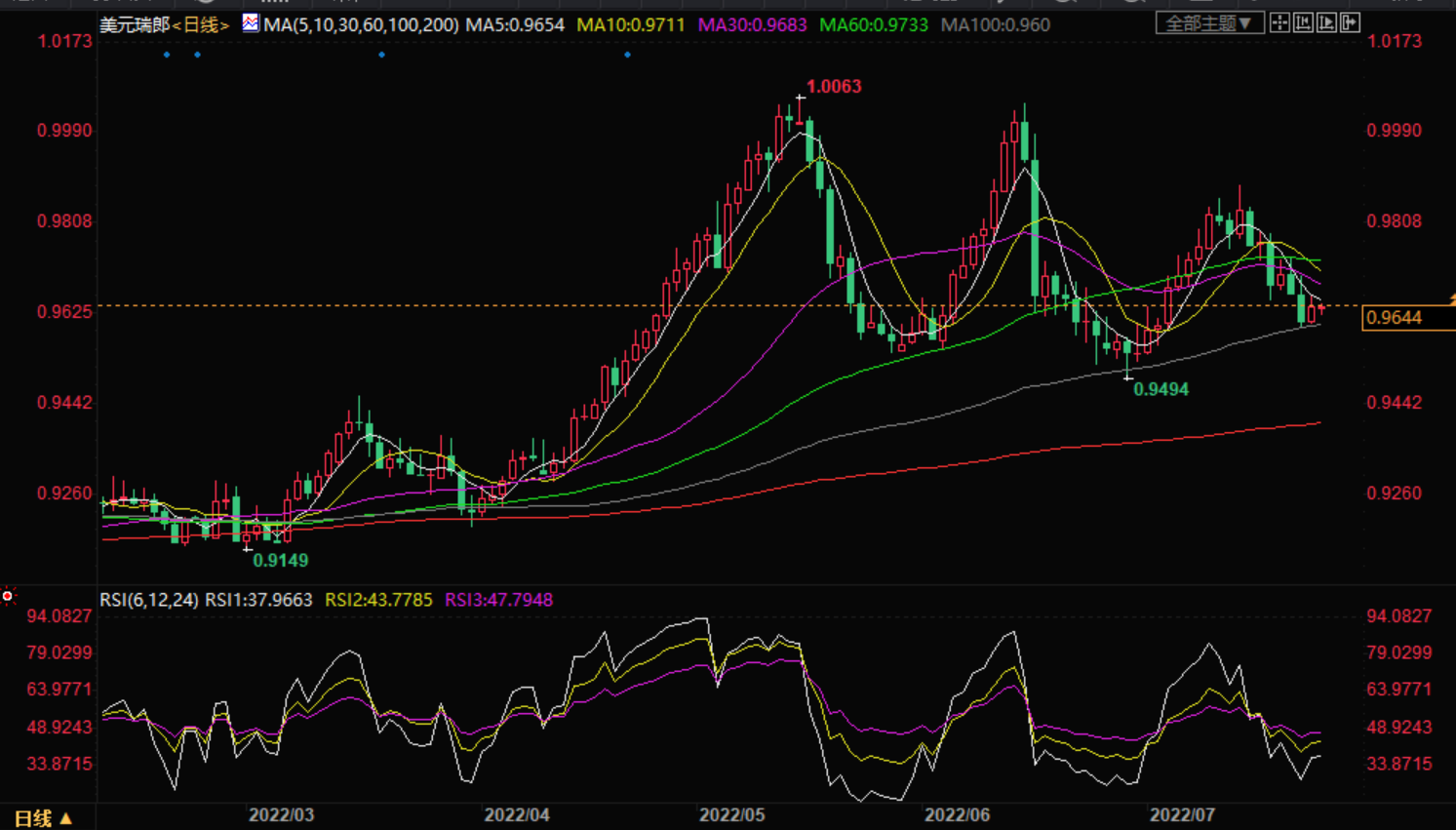 美元兑瑞郎从上周低点100日移动均线(日移动均线)0.9600反弹,随着交易员为美联储周三的货币政策决定做准备,美国股市波动,市场情绪好坏参半,美元兑瑞郎小幅走高。 基本面上,长期通胀预期指标前值录得3.1%,而目前公布的长期通胀预期指标录得2.8%,降低美联储加息100个基点的预期。然而,美联储肯定是要推出更多收