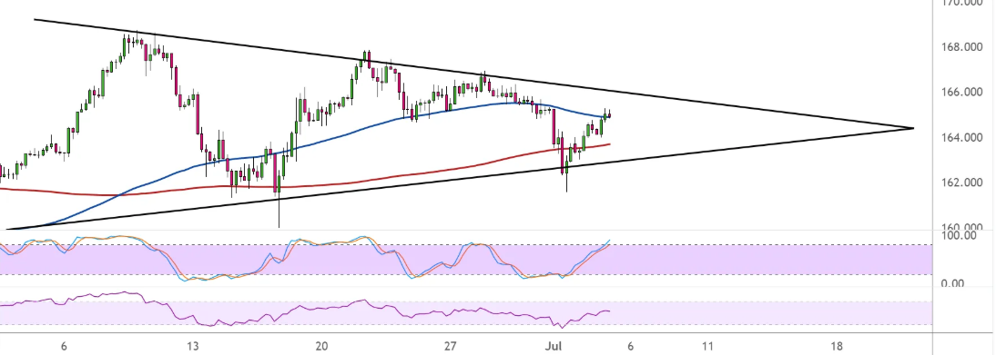 周二,英镑兑日元在其4小时的时间框架内形成了较低的高点和较高的低点,形成了一个对称的三角形格局。价格最近刚刚从支撑位反弹,看起来很适合在166.00附近测试阻力。 如果阻力保持不变,英镑兑日元可能会在164.00左右跌回三角底部。另一方面,突破高点之后,可能会出现与图表形成高度相同的反弹。 100移动平均线