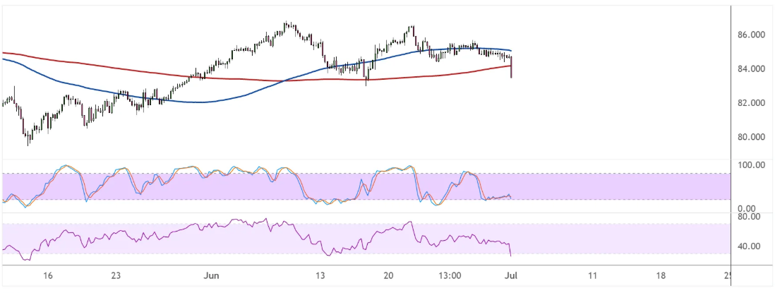 纽元兑日元可能会从其上行趋势中逆转,因为该货币对正逐渐接近测试其双顶模式的领口。跌破支撑位可能引发与图表形成高度相同的下跌趋势,或在250点左右。 100移动平均线仍然高于200移动平均线,这表明阻力最小的路径是上行,或者支撑更有可能守住而不是突破。在这种情况下,该货币对仍有可能反弹至86.50至87.00附近的