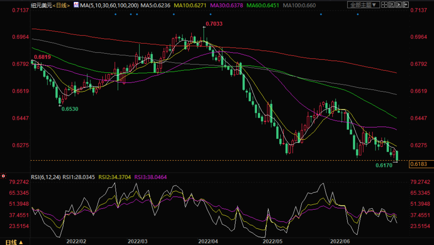 周五,纽元兑美元在高点0.6246跌至目前的低点0.6228。美元自隔夜低点走强,提振纽元。 基本面上,周四焦点是C物价指数月率增速加快、个人收入稳步增长以及支出增长放缓。5月个人收入上升0.5%,符合预期,与前值0.5%持平。其他数据方面,6月芝加哥采购经理人指数自前值60.3降至56.4。已经发布的其他制造业数据表明经