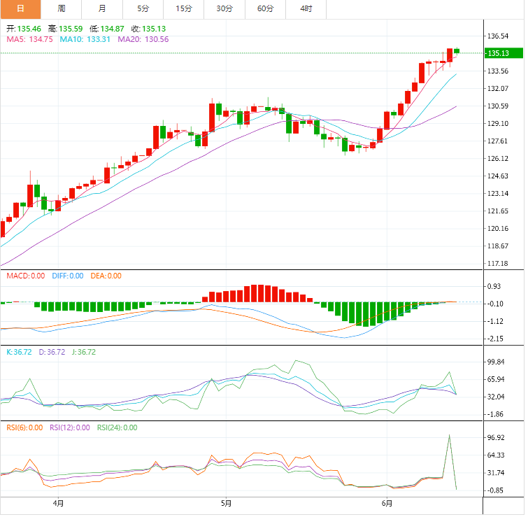 美元兑日元维持盘中跌势,空头徘徊于盘中低点,录得三周最大单日跌势。该货币对在周三欧市早盘自1998年以来的最高水平反转,目前位于135.00附近。 基本面上,汇价最新跌势可能与乐观的日本数据、美国国债收益率回调以及市场为美联储利率决议做准备有关。日本4月机械订单同比暴增19%,预期增长5.3%,前值7.6%。政府报