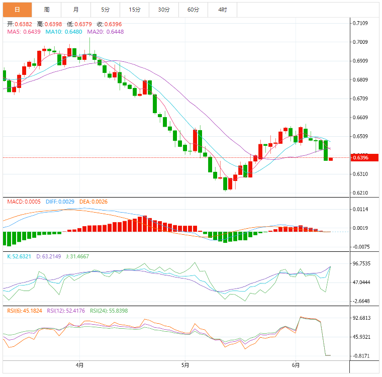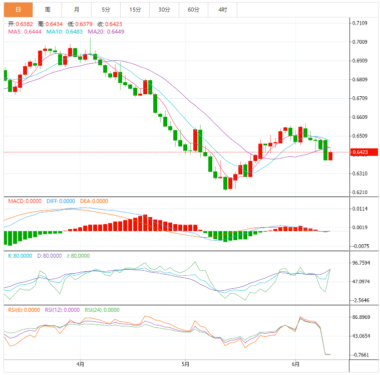 周五,纽元/美元整理于0.6382-0.6391窄幅区间。纽元/美元从周四的高点0.6461大幅下行之后,汇价已经横盘整理。预计纽元/美元大幅下跌后将出现回调,将为主动卖家提供机会,并在最佳水平出现空头。 基本面上,纽元多头构筑双顶后出现急剧下跌,这表明汇价微弱尝试突破前期高位。美元多头突破供应区后打压汇价跌破0.640