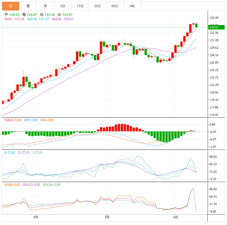 亚太市场行情走势分析 1)亚太市场 A股市场:A股三大股指午后持续走高,沪指涨幅扩大至1%,深成指涨逾1.5%,创业板指涨逾1.7%,北向资金净流入超64亿元。盘面上,汽车、稀土永磁等板块涨幅居前,航空机尝基础建设等板块表现疲软。 港股市场:恒生科技指数收涨0.89%,报4792.02点,此前一度跌超3%;科网股普涨,