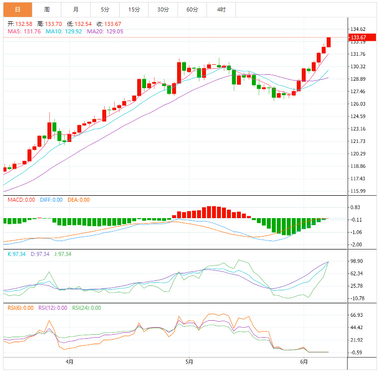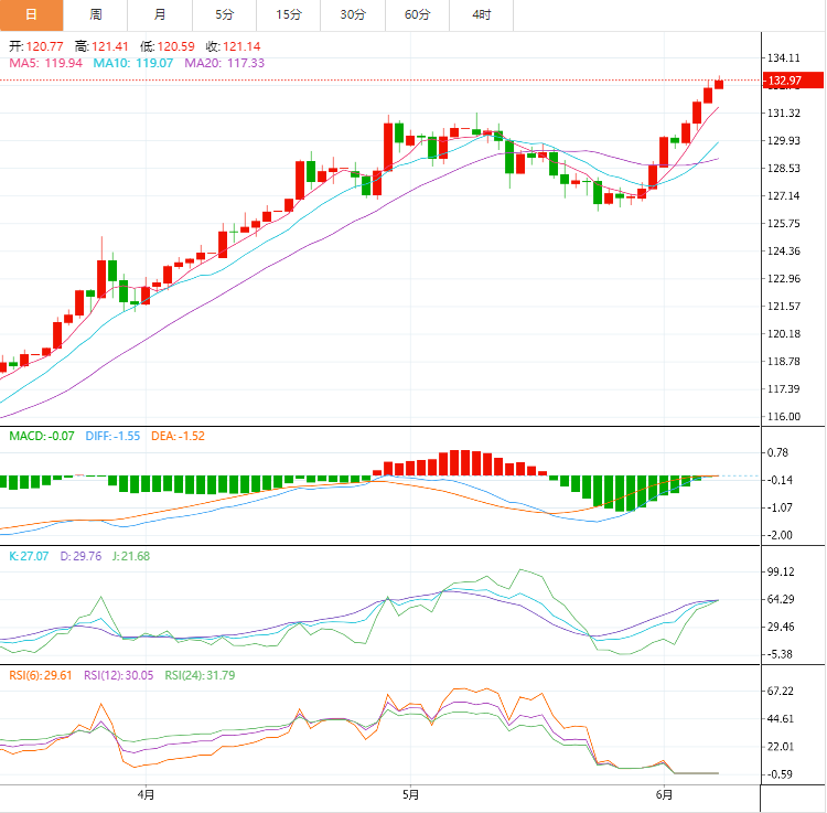 周三,美元兑日元汇率处于近20年高点附近,目前见于132.80-132.85区域附近,当日上涨近1.0%。 基本面上,周三经修订的政府数据显示,日本经济日本第一季度季调后实际GD年化季率修正值收缩0.5%,略好于最初预期收缩1.0%。日元处于弱势,但上述数据对日元的影响不大。美元/日元盘中上涨0.18%,涨至132.80。 技术面