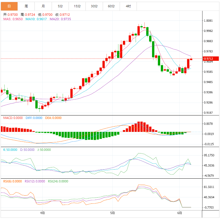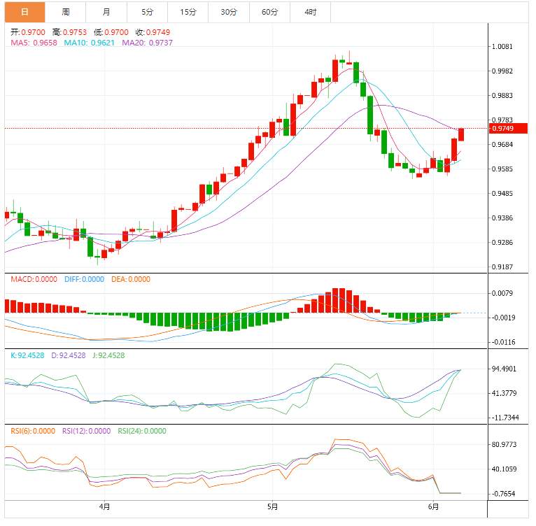 周二盘中,美元兑瑞郎自5月23日以来首次突破0.9700大关。截止目前,美元兑瑞士法郎的交易价格为0.9709,录得0.01%的最小涨幅。 基本面上,美元/瑞郎出现下跌,刷新日内低点0.9620附近。在这期间,这一瑞士货币(CHF)对验证0.9640阻力位强劲,该阻力位汇合3月下旬至5月中旬上行趋势50%斐波位和10日均线。 技术面上,